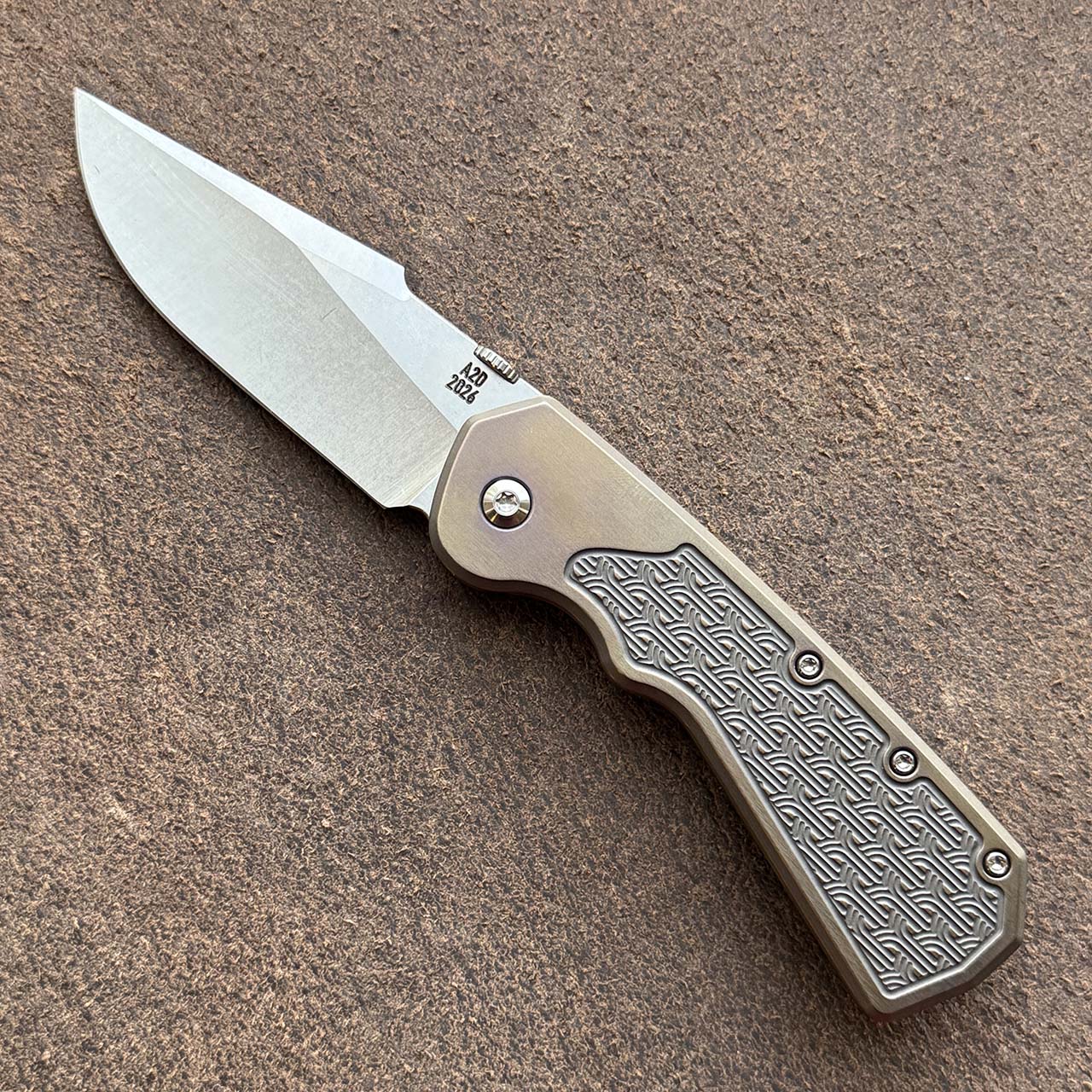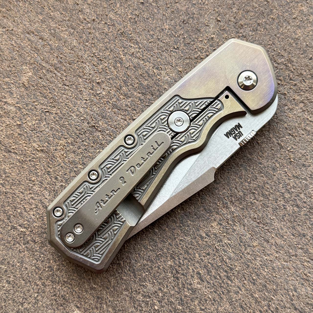 A2D Attn2Detail Mercantile Delta Framelock Folder Titanium Handle Arches "Inlay" Scales Satin Stonewash Harpoon Rising Grind Magnacut Blade