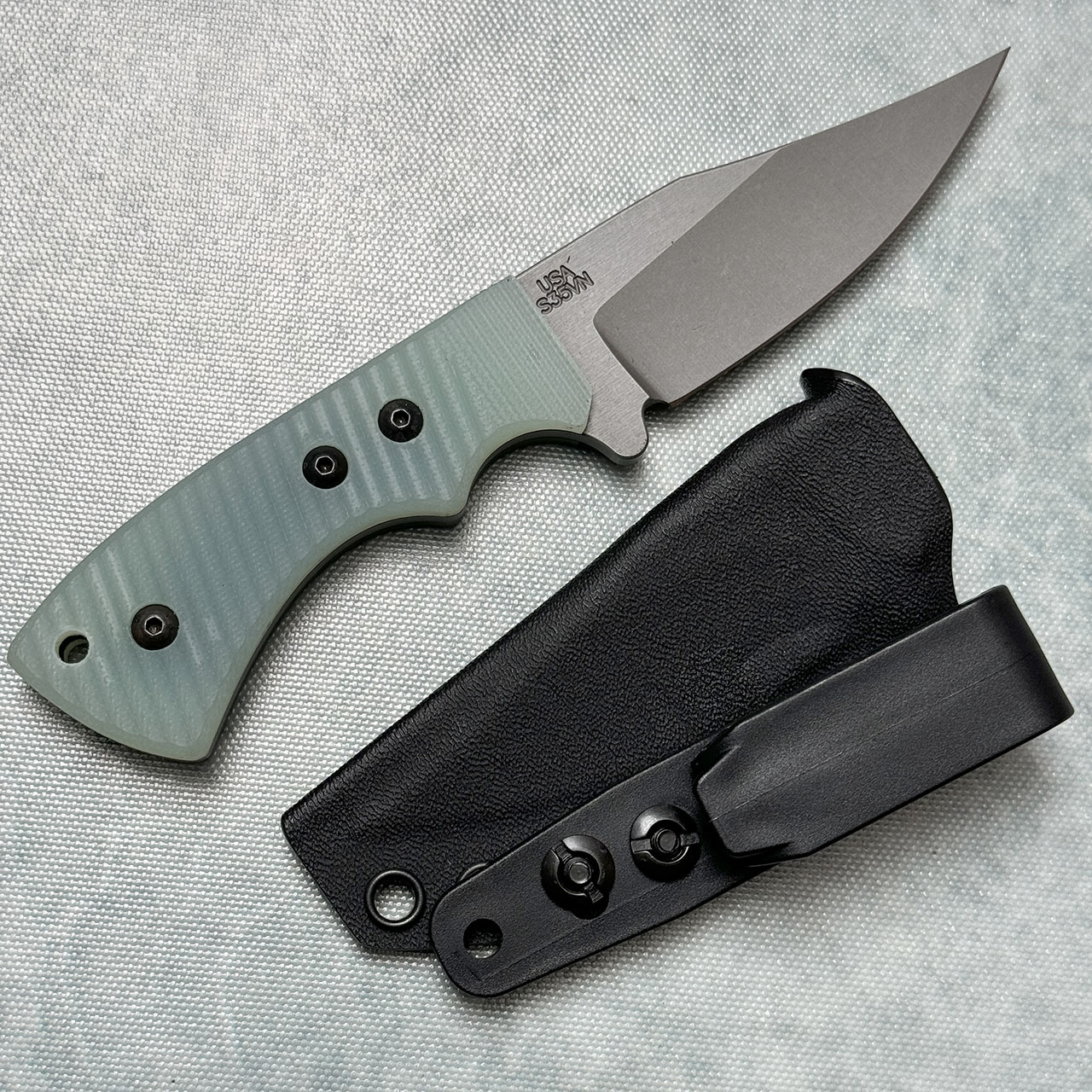 This model features a stonewashed finished CPM-S35VN bowie blade with standard cutting edge, Natural Jade G10 handles. Comes brand new from Cancon with sheath.