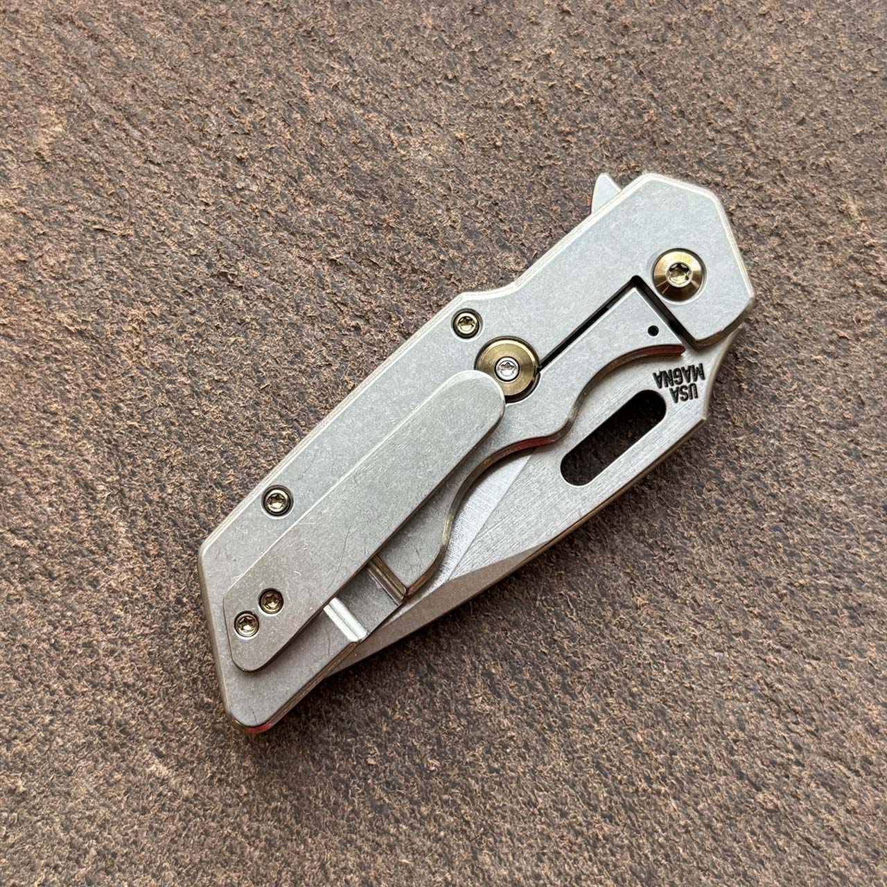 This model features a stonewash satin finished Magnacut drop point rising grind blade with standard cutting edge, brightwash titanium handles with bog oak inlay and bronze hardware. Comes brand new in padded, zippered pouch.