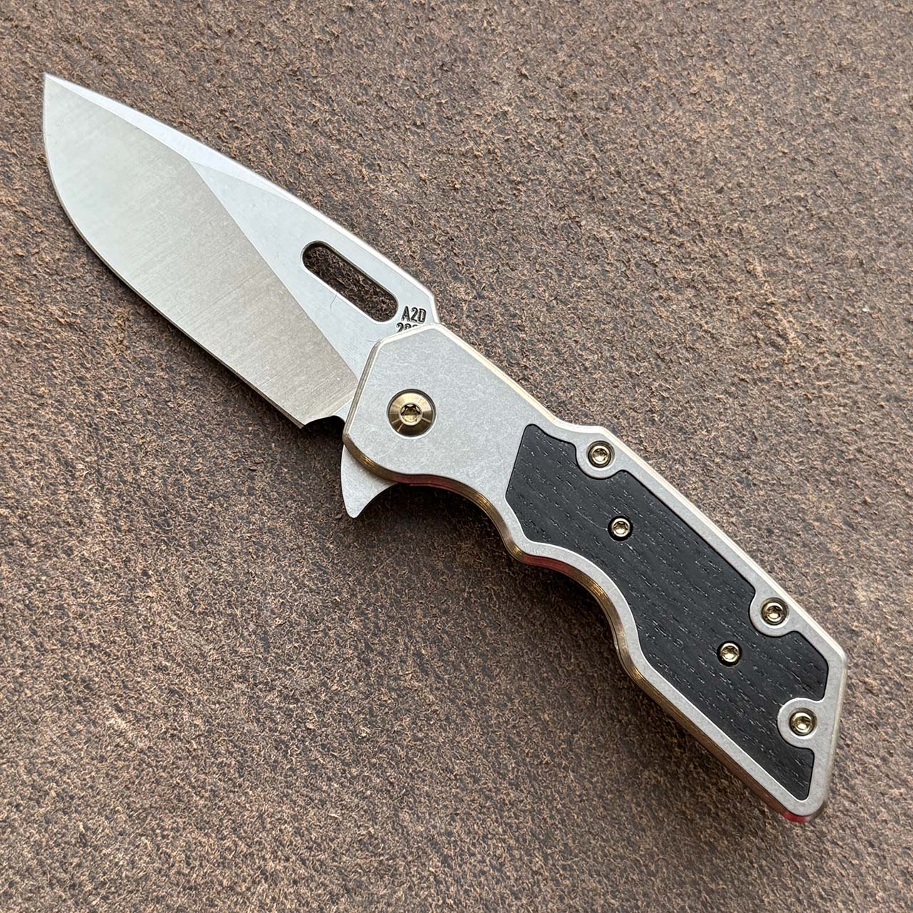 A2D Attn2Detail Mercantile Mark 1 Medium Gen 4 Folder S/E Titanium Handle w/ Bog Oak Inlay Stonewash Satin Magnacut Rising Grind Blade