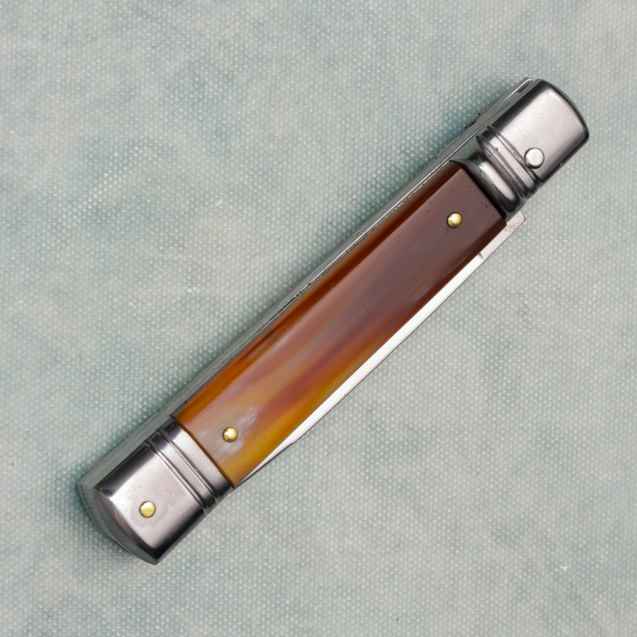 Classic Italian stiletto design with a lever lock mechanism. The leverletto's by Bill DeShivs and AKC have some hard hitting action and solid lock up. A must have for the Italian stiletto enthusiast. Beautiful horn handle scales. Satin stainless steel spear point blade. Brass handle pins. Fancy nickel silver bolsters, liners, and lever. New.