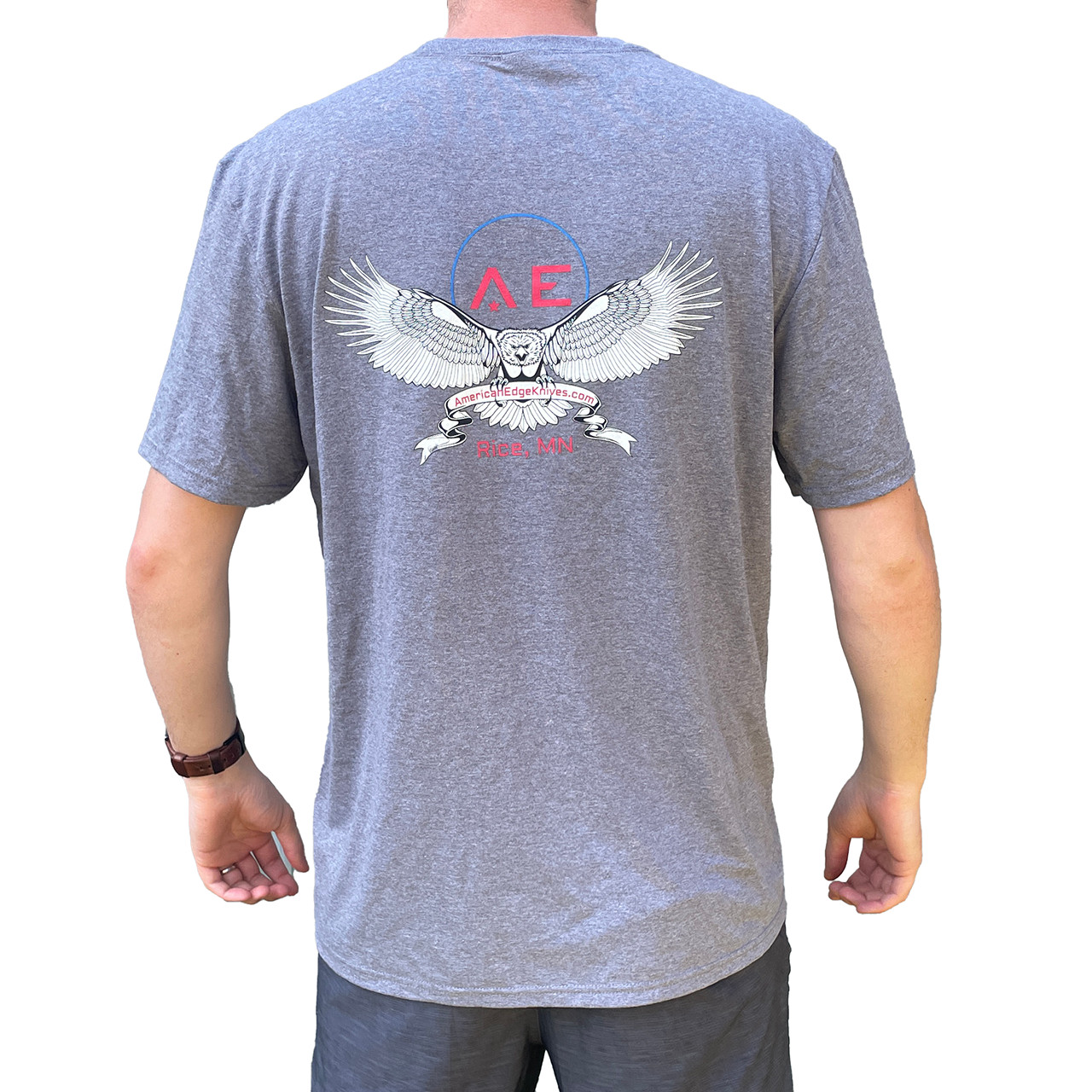 Show off your favorite knife dealer! Super comfy soft tri-blend tee with "American Edge" across the front and our logo with eagle over the back.