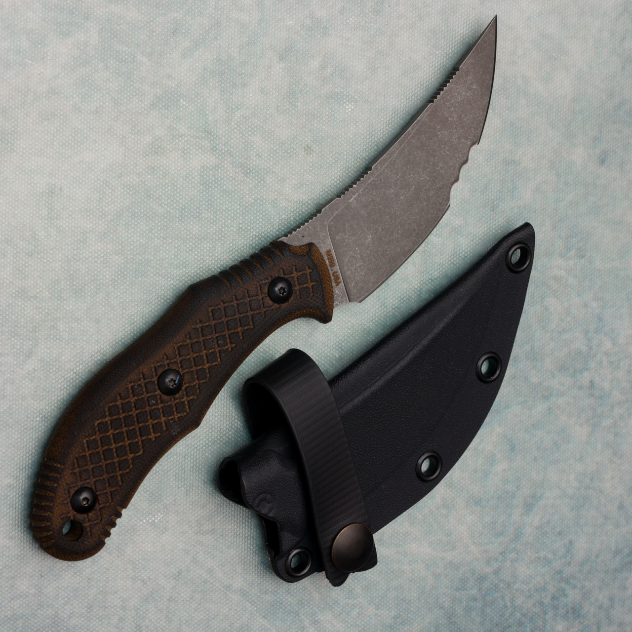 The Chopper from Bastinelli Knives is best suited for CQC. With a trailing point blade, this blade can be used for utility and daily cutting tasks. This knife features a 3D machined torched micarta handles that are perfectly conotured to follow a natural shape of your hand. Bastien custom serrated and stonewashed this blade. You will also receive a friction fit Kydex sheath with single strap for horizontal belt carry. Made in the USA.