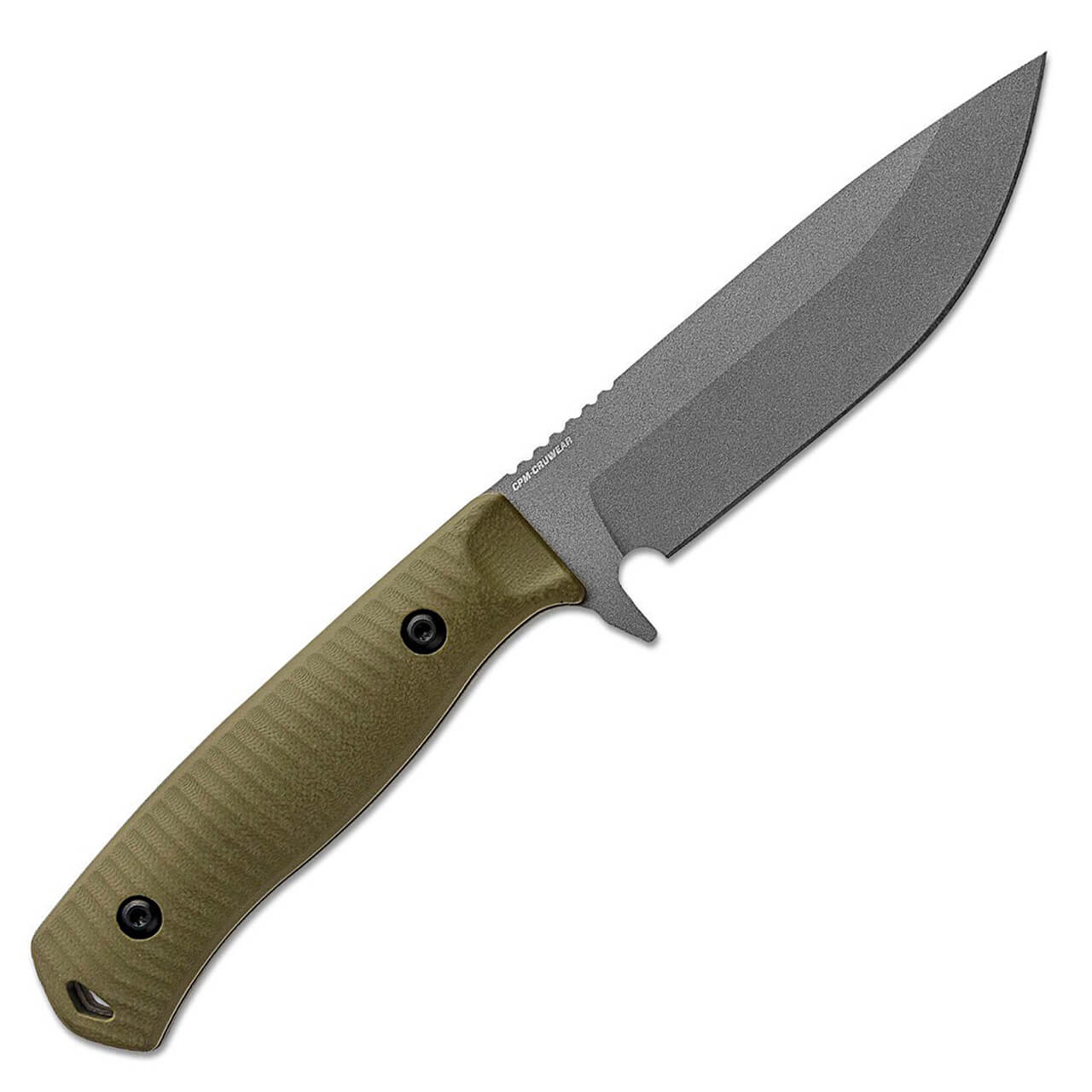 Grab your gear and head into the sticks with the 539GY ANONIMUS on your hip and be prepared for whatever the bush throws at you. This fixed blade survival knife is ideal for bushcrafting, thanks to a CPM-CruWear blade with good edge retention and a Cerakote finish. The spine has jimping and the tail end features a lanyard loop. Complete with a striking choil, textured OD green G-10 handle scales, and a Boltaron sheath with ferro-rod loop. This is the knife you need at your side when you are off the grid. Brand new in box.