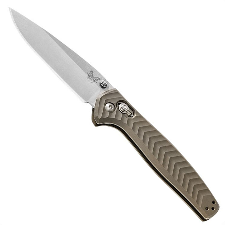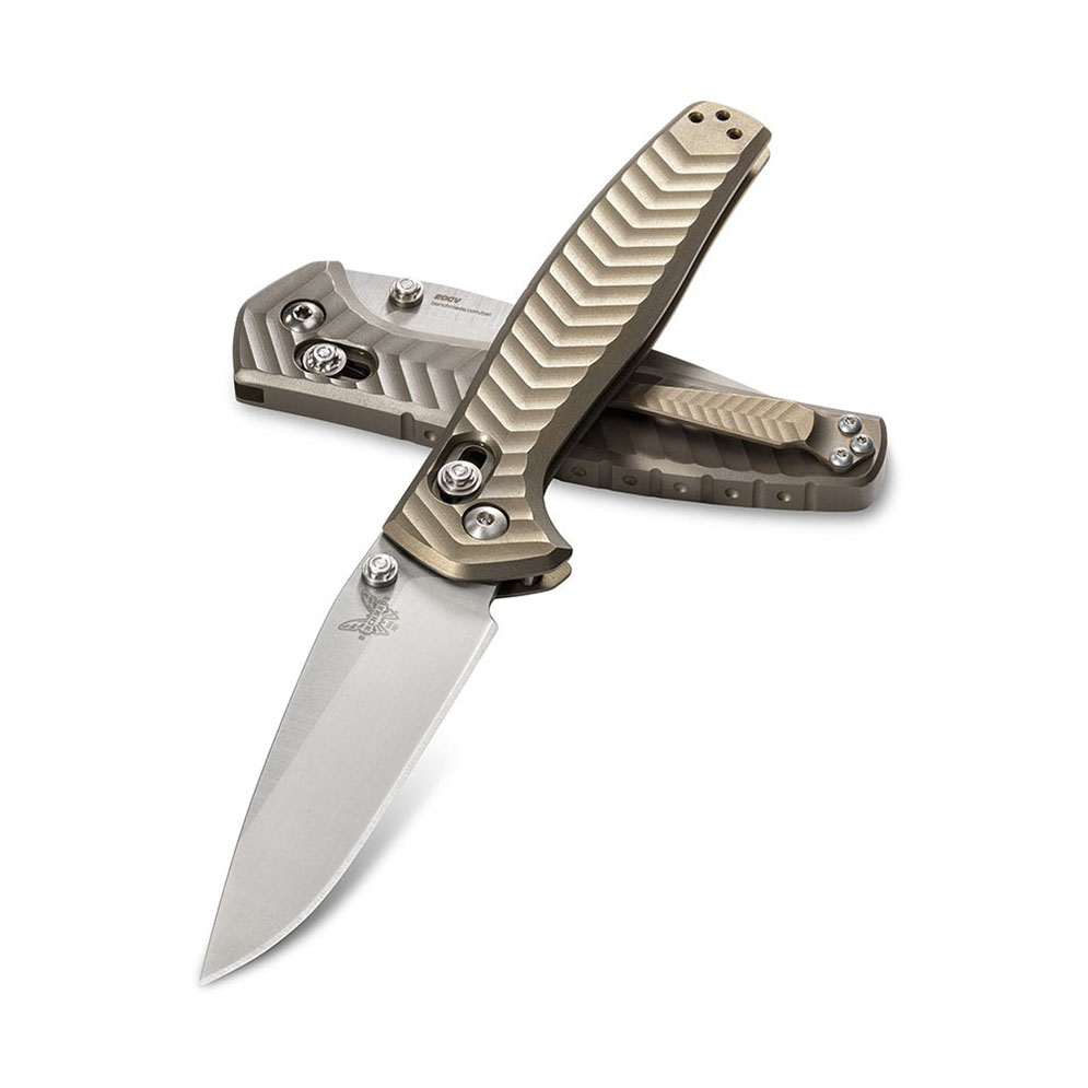 This model features a bronze finished titanium handle. Stonewash finished CPM-20CV stainless steel clip point blade. Stonewash finished hardware. Bronze finished titanium pocket clip. Brand new in box with Benchmade drawstring pouch.
