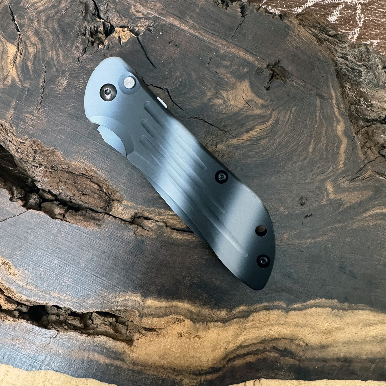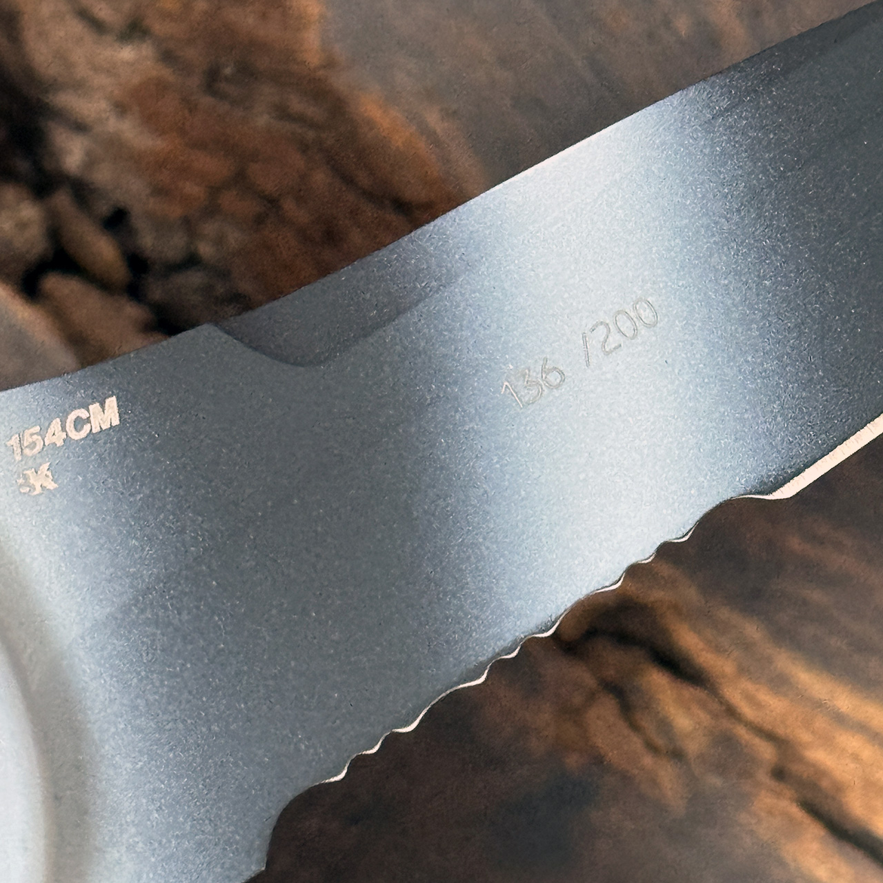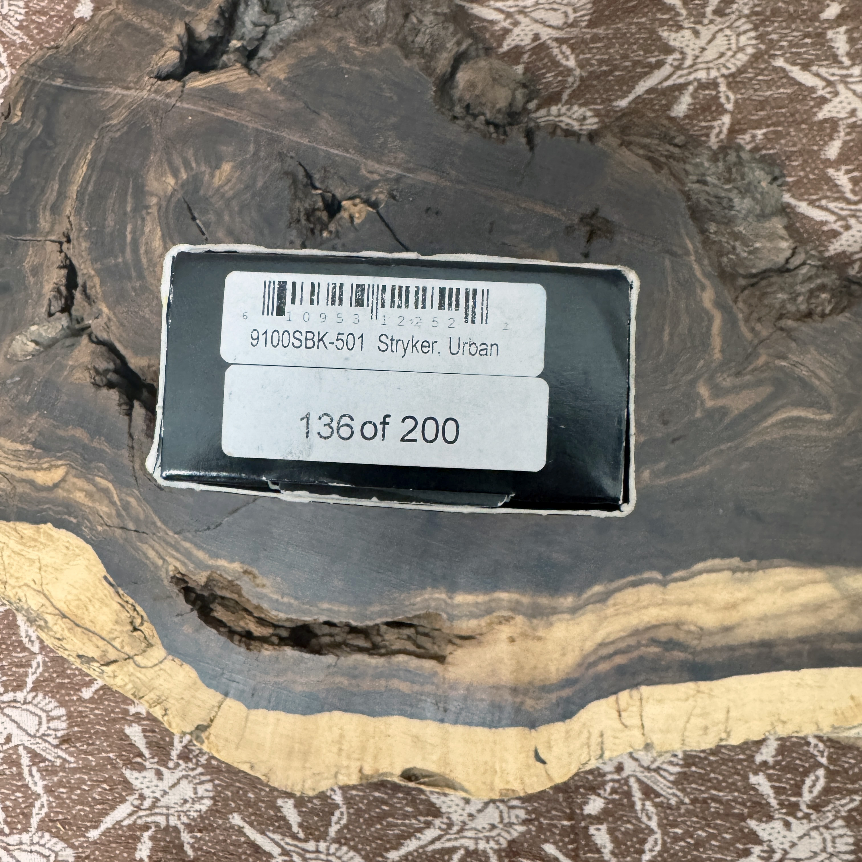 The original Benchmade 9100SBK Auto Stryker features a push-button automatic mechanism with integrated safety. The tanto blade is 154-CM stainless steel with a cerakote finish and a partially serrated cutting edge. The handle is machined 6061-T6 black anodized aircraft aluminum and also includes a reversible tip-up pocket clip. This configuration is a very limited numbered Urban Camo edition. Serial number is etched on the back of the blade #136 of only 200 made. Like new in original box.