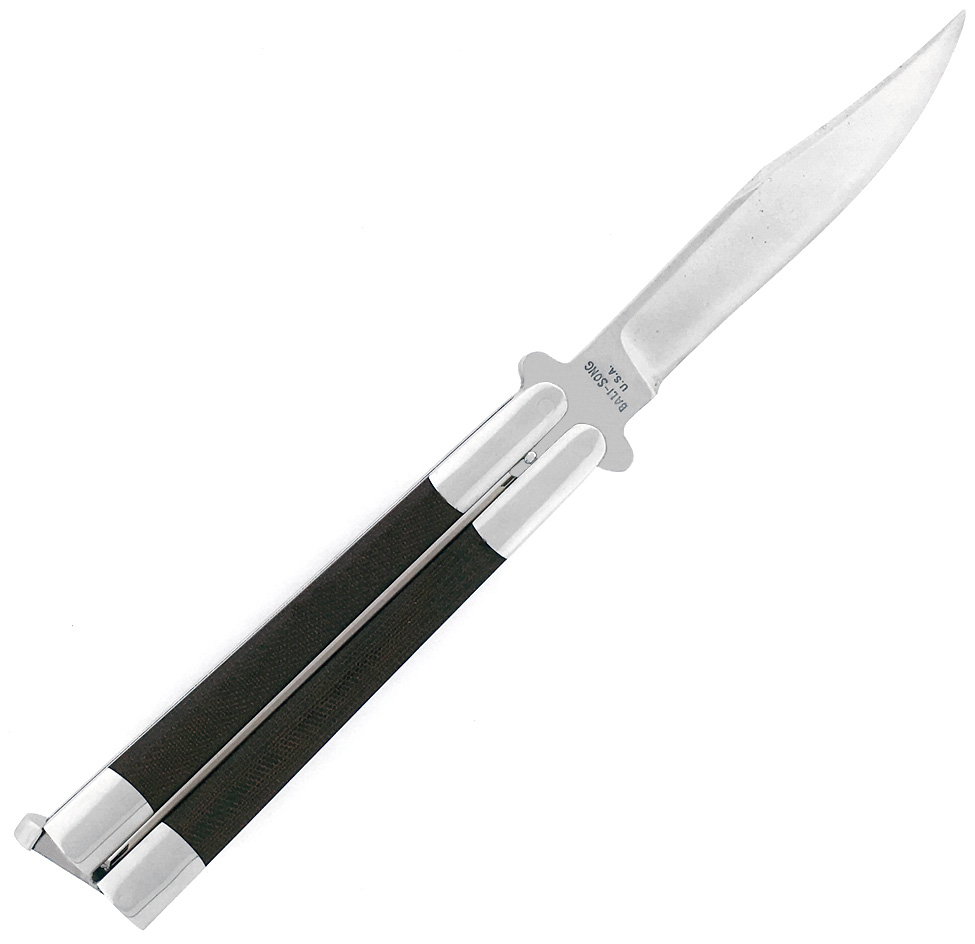 This is a rare and collectible vintage pre Benchmade Balisong Inc Jody Samson butterfly and features the origins of the winning design and build that has made Benchmade famous. If you're looking for a great old butterfly knife with a a Jody Samson blade, this is the one for you. Polished stainless steel handles with green canvas micarta inlays and a T-Latch. Satin finished stainless steel bowie blade forged from thick stock and stamped Bali-Song U.S.A. with the Balisong logo. Made in the 1980's and very hard to find now days. This knife looks to have been flipped and appears to have been expertly sharpened. Also has some very light pitting on the back of the blade. All in all still in great condition and worthy of your collection! This is one of the Bali's that started it all back in the 1980's.
