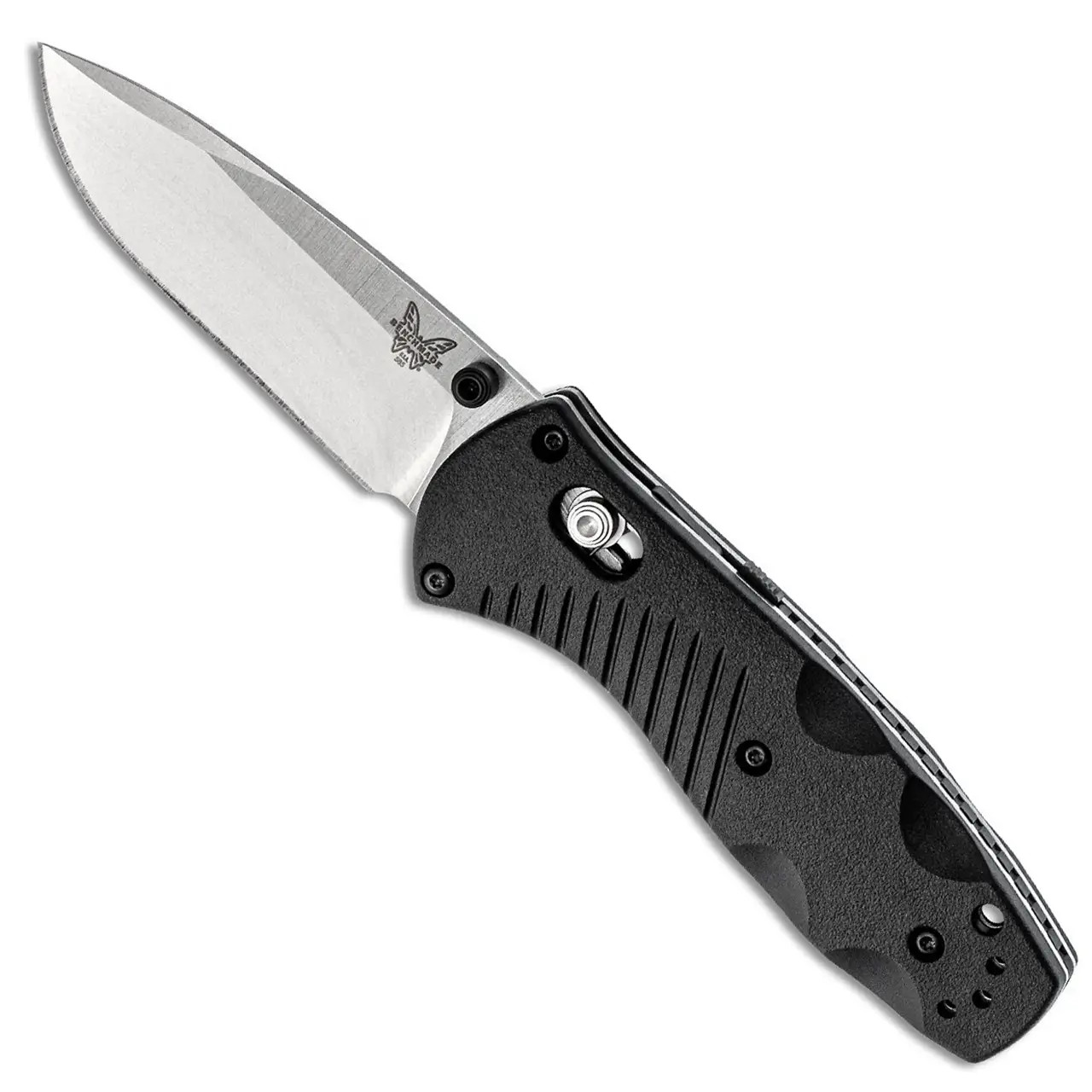 Contoured valox handle scales provide good grip and feel. Stonewash finished 154-CM stainless steel drop point blade. These spring assisted models combine speed and strength in one complete package! The 585 series is comfortable and quick. Coming in a bit smaller than the full size Barrage makes this one ideal as an EDC and for those with smaller hands. The Mini Barrage knife has a safety on the back and a reversible tip-up pocket clip for easy carry. Brand new in box with Benchmade slip pouch.