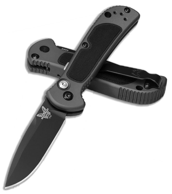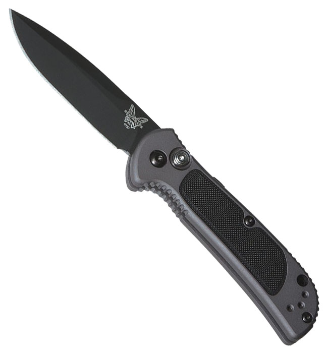 This new Benchmade push button automatic is a big deal in a small package! Gray anodized 6061-T6 billet aluminum handle scales with black G-10 inlays for added grip. Black coated CPM-S30V stainless steel drop point blade with a nearly full length swedge for added piercing ability. Jimping around the handle for a no slip grip. Sliding safety on the spine. Reversible black coated stainless steel pocket clip for tip up carry and lanyard hole. A pocket friendly size, tactical everyday carry knife with hard hitting automatic action! Now discontinued. Brand new in box.