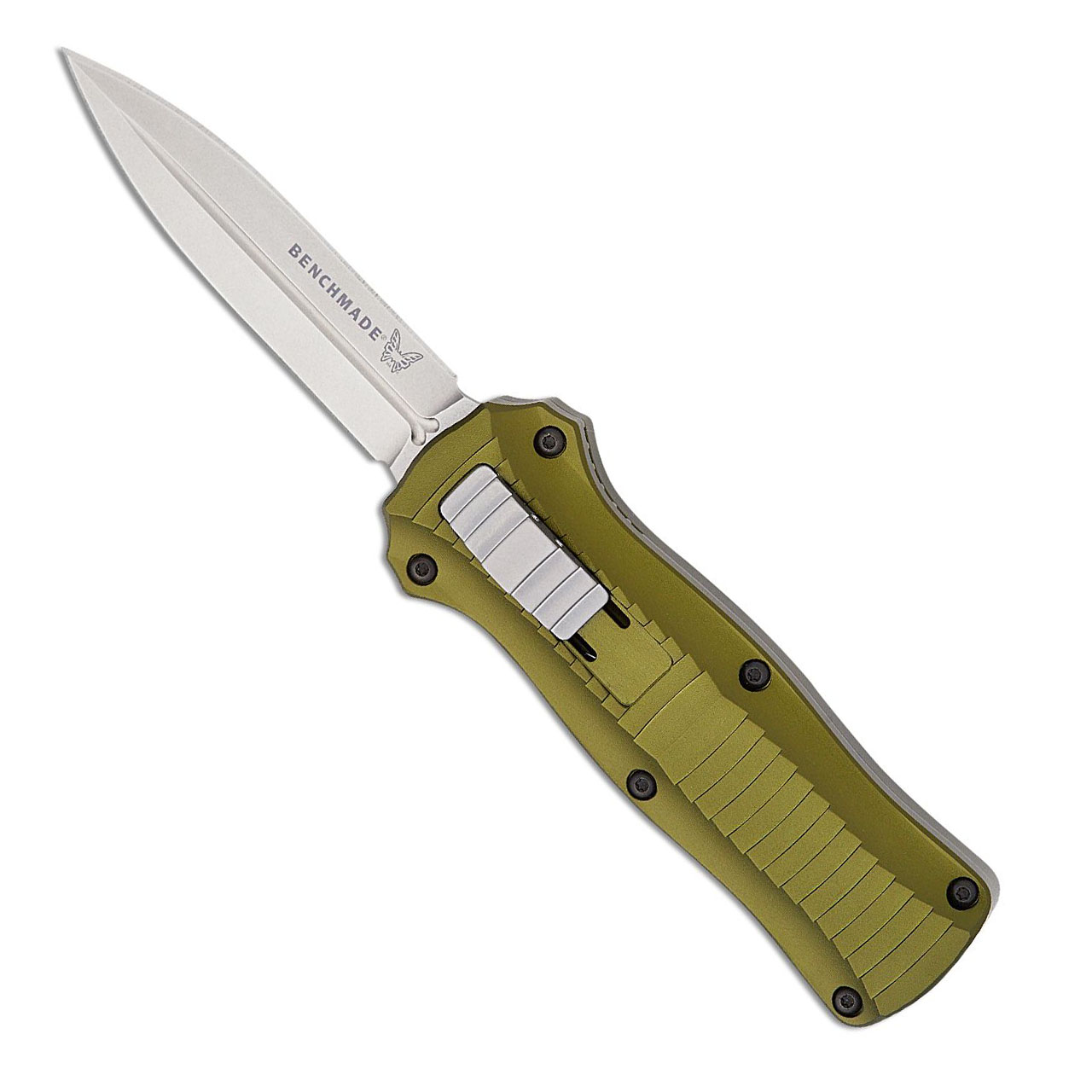 A McHenry design. Built for strength and reliability, the patent pending double action mechanics are built for the long haul. Grab on and you will find the handle grip rock solid with its patented machined in Presidio style, bi-directional tread pattern, and overall smaller size than its big brother. Slide the release forward and the CPM-S30V stainless steel, double edged blade locks up with a unique three point retention system. Reverse the process and the blade retracts in a rapid blur of motion. Brand new in box with nylon Benchmade sheath.