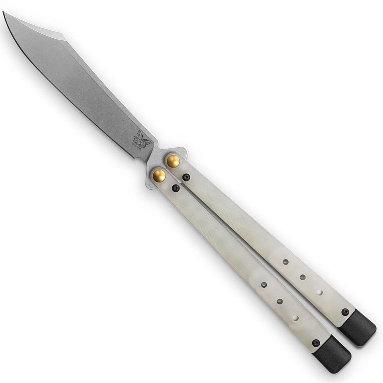 A high performance butterfly knife with a focus on flipping, available in two highly customizable variants that pay homage to Benchmade's roots with a return to our Bali-Song's classic form and added bonus features. Optimized for expert flippers with latchless G10 handles and a CPM-S30V Scimitar blade, fine tune Necron's balance and speed with adjustable tungsten weights and extendable handles for your perfect flip and desired feel. Finished off with a hollow diamond texture found on the safe handle to give the user a tactile indication between the safe and bite handles. Brand new in box.