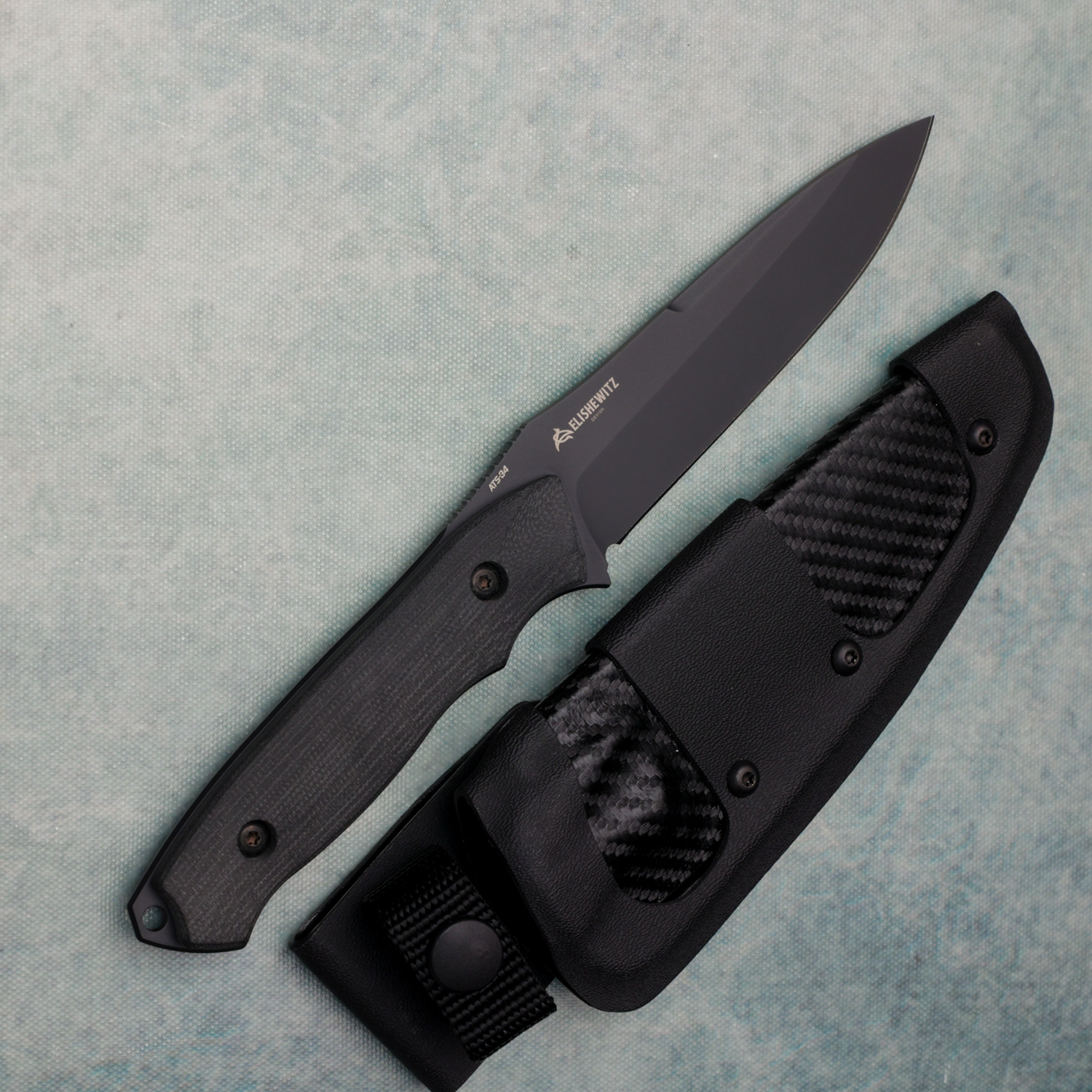 The Nimravus is a high quality and well built tactical fixed blade knife. BT2 coated ATS-34 black blade. The handle is ergonomically shaped with an indexed finger groove and jimped thumb ramp for superior grip. Full tang construction. Black micarta handle scales, the back scale is darker than the front. Lanyard hole/skull crusher. Has a few marks on the blade, in box with a toughkydex and carbon fiber sheath.