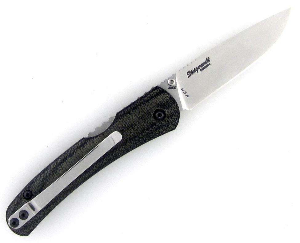 Steigerwalt Design, Benchmade knife - hand picked by the NRA. This is a great little lightweight mid lock pocket knife with a drop point blade of satin finished 440C stainless steel. Nice green linen micarta handle scales. Reversible mirror polished stainless steel pocket clip. Jimping on the spine. Thumb stud and springless lock back mechanism make for easy operation. The blade is etched NRA Outdoors Knives 12410 - Steigerwalt Design 440C USA. Comes new with zip up pouch.