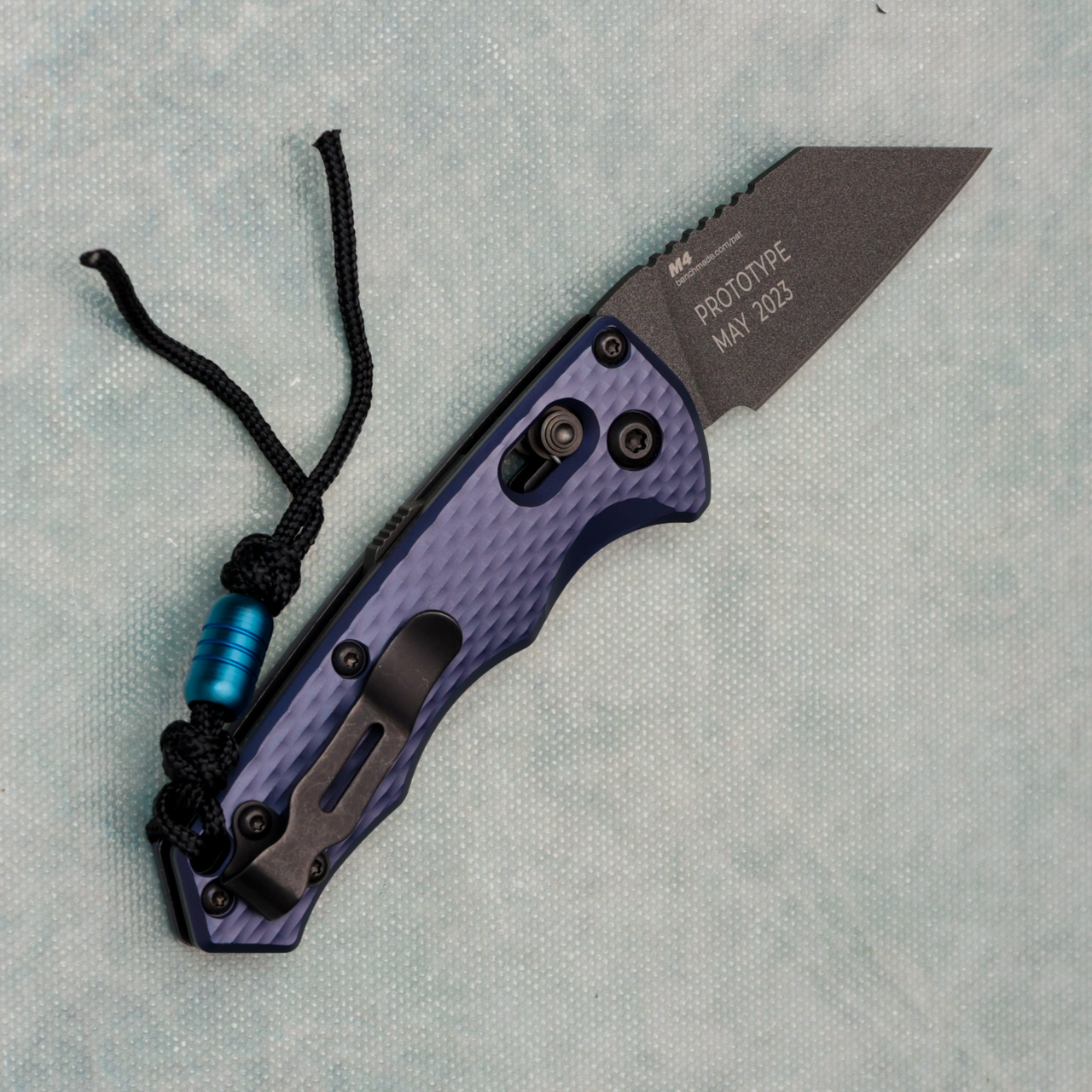 When blade length is restricted, necessity isn’t. Designed for ease of concealment and compact utility, the Partial Immunity features a 1.95 inch CPM-M4 blade with a Cobalt Black Cerakote finish allowing you to carry it in the most restricted areas, boasting outstanding edge retention and strength in a Wharncliffe profile tapering to an ultra fine point. The included lanyard speeds up retrieval from the pocket for deployment in evolving situations. Finished with anodized crater blue aluminum handle scales, the Partial Immunity is a concentrated dose of full fledged utility in a compact configuration. Original prototype from 2023 that was a salesman sample, in box in like new condition.