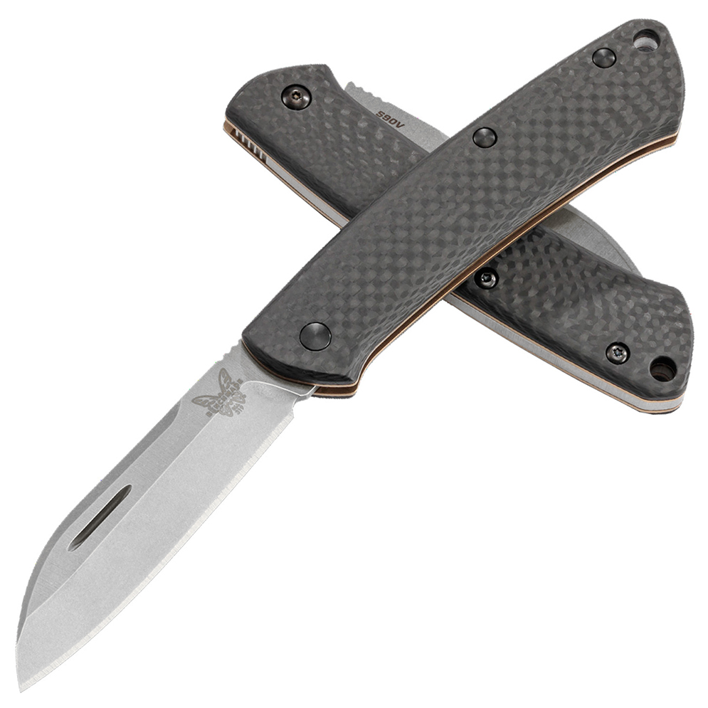 A simple yet modern take on a classic gentleman's pocket knife. Thin, lightweight, and nicely contoured green canvas micarta handle scales over skeletonized stainless steel liners. Stonewash finished CPM-S90V stainless steel sheepsfooot blade with a nice deep nail knick. Smooth and strong open, close, and half snap. Jimping on the spine. A lanyard hole adds a nice touch. Benchmade's take on a classic slip joint is a home run! Now upgraded with Carbon Fiber handle scales, DLC finished hardware, Bronze PVD finished liners, and CPM-S90V steel blade. Brand new in box.