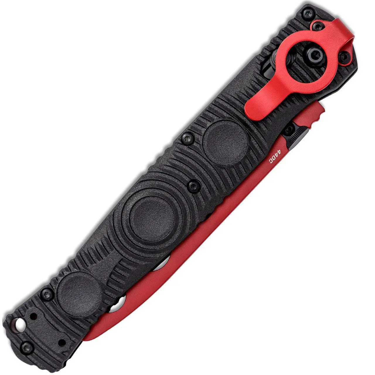 This model features black molded CF Elite handle scales. Red Cerakote finished dull 440C steel spear point blade. All black hardware, four position red pocket clip, and thumb disc. Lanyard hole and glass breaker. Completely ambidextrous. Includes rapid deployment ring. Brand new in box.