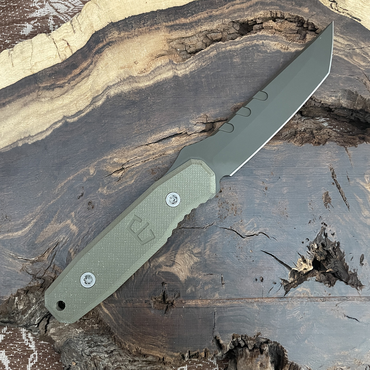 This model has an OD Green G-10 handle, OD green cerakote S35VN tanto edge blade, and stainless steel hardware. Comes brand new in box with sheath.