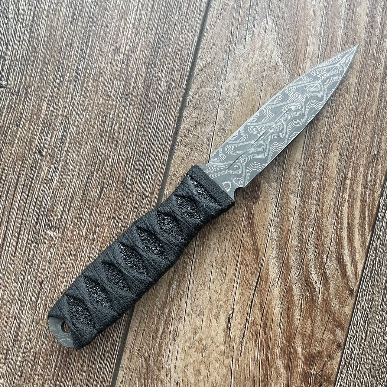 This particular model features a black Starlingear handmade lacer/menuki wrapped by Bastinelli and a Chad Nicols Damascus dagger blade. Comes brand new in box with sheath.