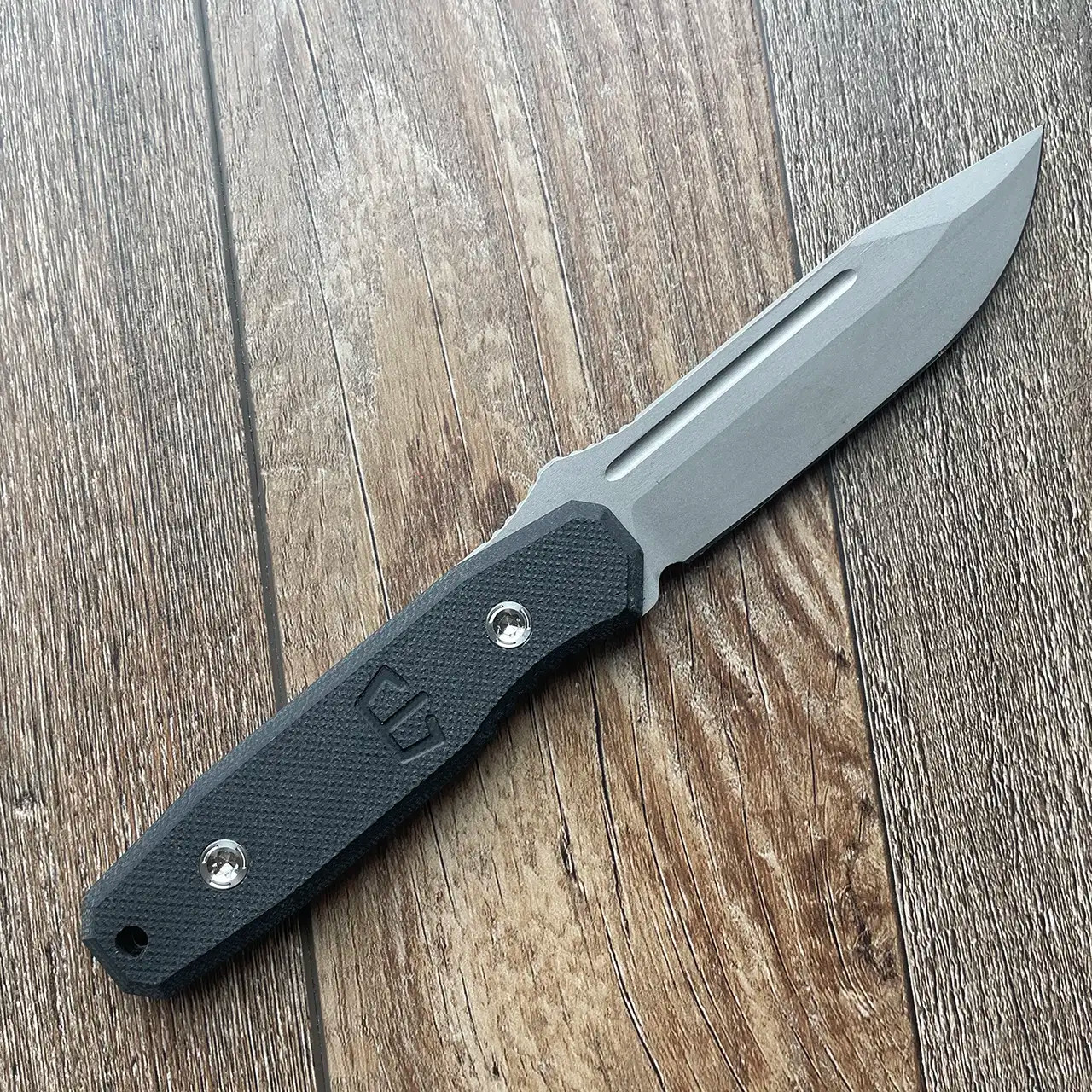 This model has a black G-10 handle, gray matter finished S35VN single edge dro point blade, and stainless steel hardware. Comes brand new in box with sheath.