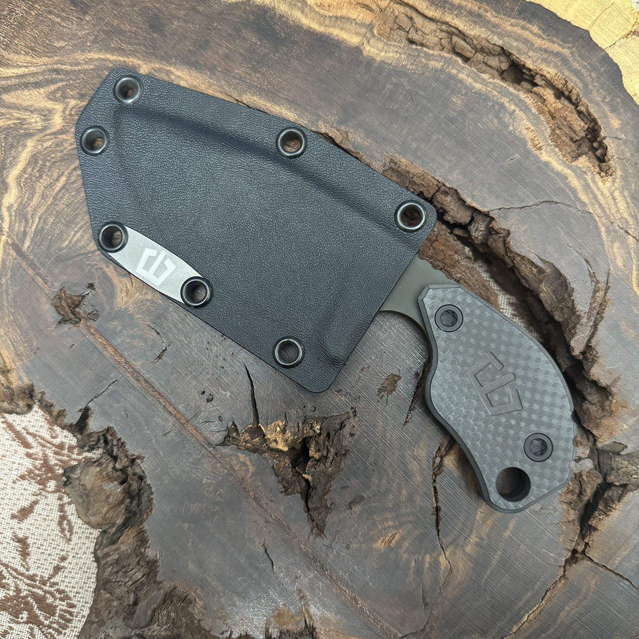 This collab features carbon fiber handle scales, an OD green finished Magnacut single edge blade and sheath. Brand new in box.