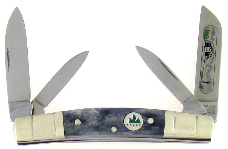 Real nice genuine grey smooth bone handle scales. Polished stainless steel sheepsfoot blade etched with a housein the mountains scene, spear point blade and twin pen blades. All the blades have good snap. Brass liners. Nickel silver stepped bolsters, handle pins and inlaid Boker mountain scene shield. This is an awesome Boker pocket knife. The serial number #048 is etched on the front bolster. New condition, no box.