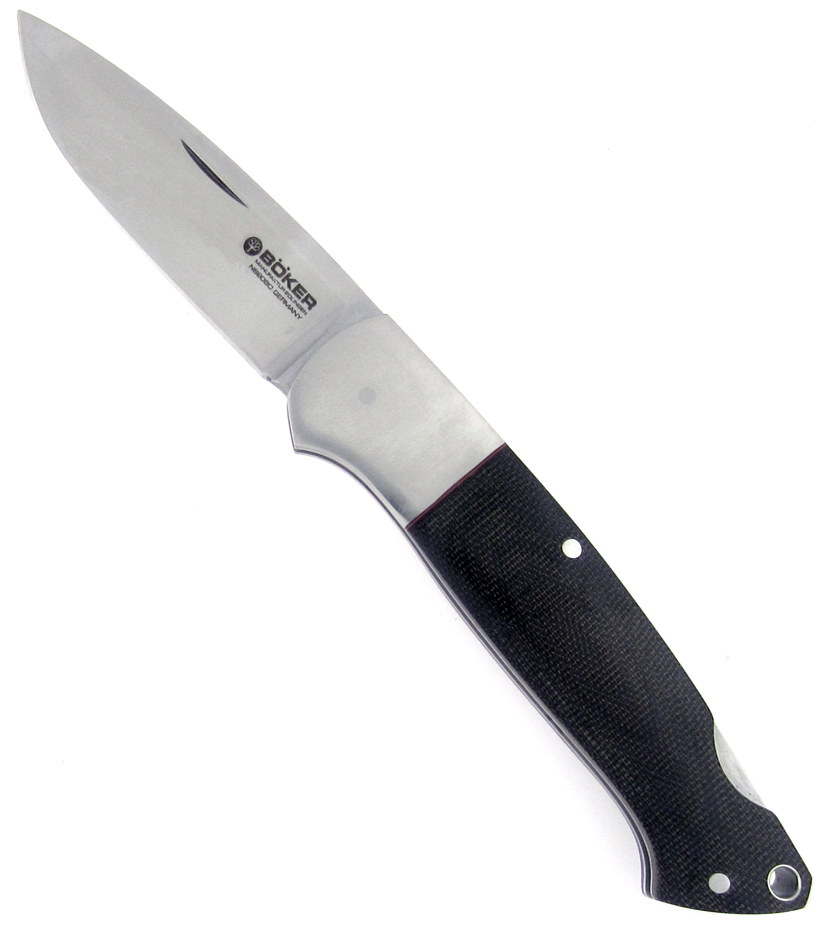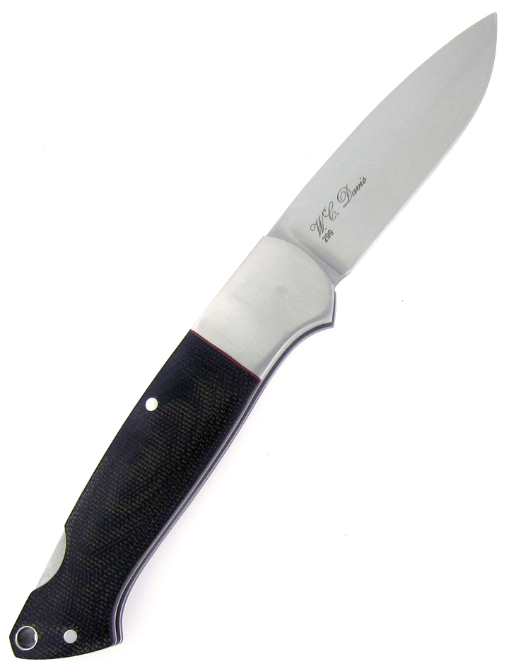 A premier introduction - already set to be a true classic. The design of Missouri knifemaker, W. C. Davis, stands out with the traditional drop point blade, whose shape has proven successful in the areas of hunting and outdoor use for decades. The stainless steel tang and bolsters carry scales of polished green canvas Micarta, which provides an excellent grip, even under wet conditions. The red fiber layers create an attractive contrast to the high polished steel. The blade steel is high quality N690BO, with a Rockwell Hardness of 58-60, and offers a most impressive cutting ability. Another special aspect of this piece is its slim-line construction, which allows comfortable carry in the pocket. Brand new in box.