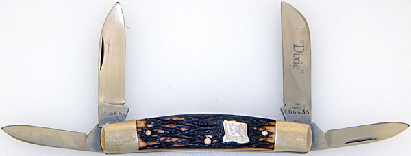 This Old Boker is part of the Great American Story series with the Johnny Rebel Theme. Large Inlaid nickel silver shield is a picture of, and say's JOHNNY REB. Jigged brown delrin handles. Nickel silver bolsters. brass liners. Large four blade congress knife. All blades have high polish, main sheepsfoot blade is etched DIXIE. Made in the U.S.A. back in 1977.