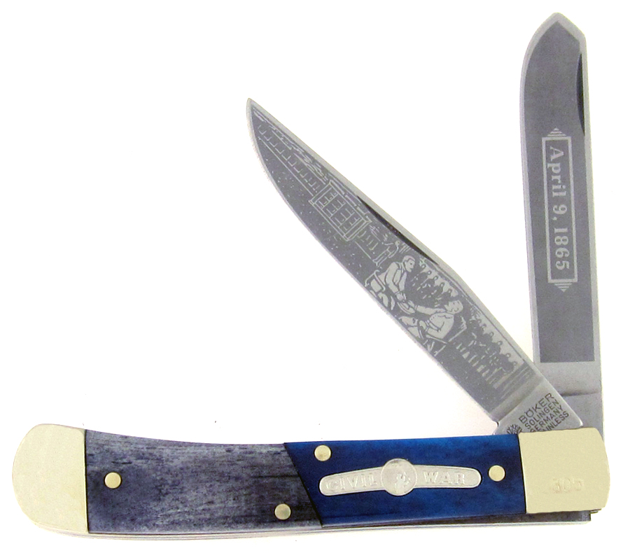 This old Limited Edition Boker Knife has awesome half and half smooth grey bone/smooth blue bone handle scales. Polished stainless steel clip point blade etched with the two Cival War generals signing the peace treaty and spey blade frost etched April 9, 1865. Brass liners. Nickel silver bolsters, handle pins and inlaid Civil War shield. The front bolster is etched with the serial number #305. Comes mint in original two piece display box with paperwork. What an awesome Boker Civil War commemorative collectors knife.