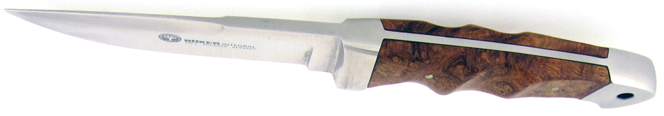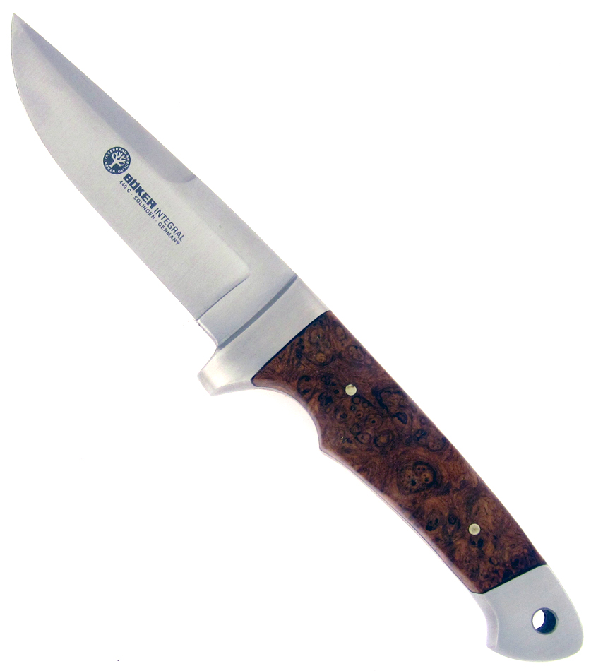Beautiful grooved amboina burl wood handle scales. Satin finished 440C stainless steel swedged drop point hunting blade etched Boker Integral 440C Solingen Germany. Integral design with a finger guard and pommel with oversized lanyard hole. Nickel silver handle pins. Very comfortable in the handle with robust construction. A perfect hunting companion by Boker. Brand new in box with quality leather sheath.