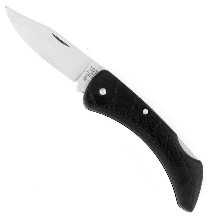 Awesome lightweight reptile texture black composite handle scales. Mirror polished stainless steel clip point blade. Tang stamped Boker Solingen Germany Stainless. Nickel silver handle pins. Excellent lightweight pocket companion. New condition, no box.