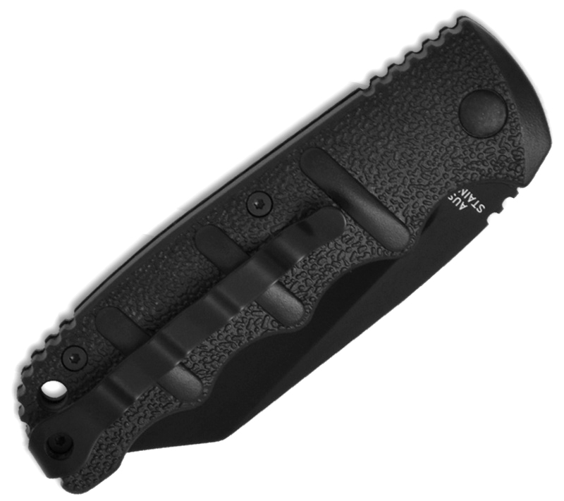 The first thing you'll notice when you get your knife is that the box is shaped like an AK-47 magazine (the name Kalashnikov comes from the Russian who designed the AK-47 assault rifle). Inside the box lays the knife- a beautiful piece of work. The knife features a black aluminum handle with molded finger grips. The design is thin, elegant and comfortable. The reverse tanto blade is AUS-8 stainless steel and black teflon coated. All black hardware. The action of this knife is first rate. The firing button is now flush with the handle to help prevent accidental opening. Brand new in box.