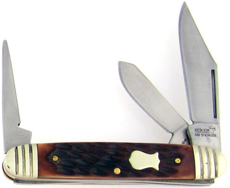 Real nice jigged brown bone handle scales. Satin finished 440 stainless steel clip point blade, spey blade, and leather punch. All three blades have good snap, long nail pulls, and are swedged at the tip. Brass liners and handle pins. Nickel silver fluted bolsters. A classy everyday pocket knife at an affordable price. Comes brand new in box.