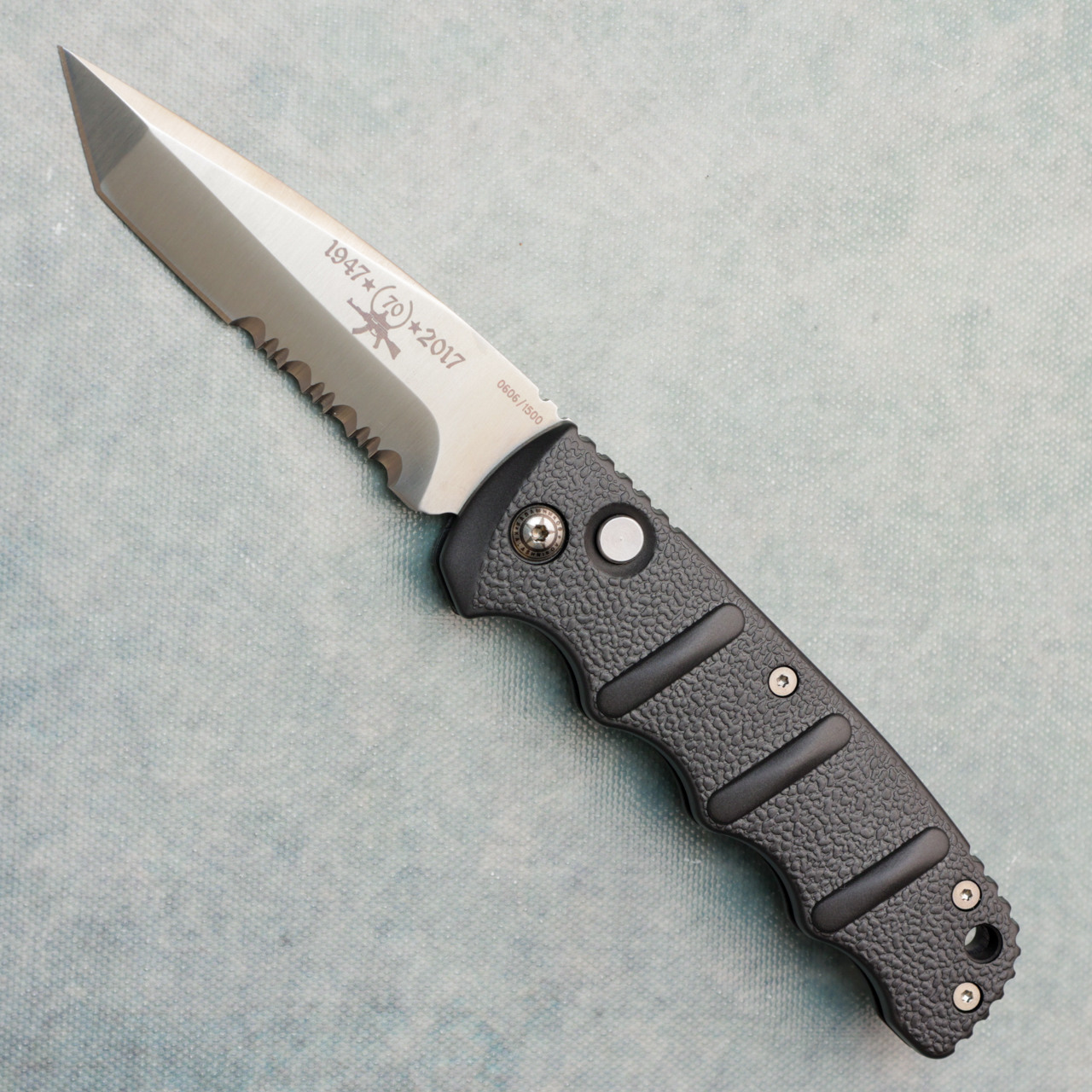 General Mikhail Kalashnikov was a longtime friend of Boker's, and the Kalashnikov series of knives have become a fixture in their lineup over the years. For the 70th Anniversary of the Automat Kalashnikov 47 assault rifle, Boker wanted to offer fans and collectors of these knives an especially exclusive model. For the blade steel, they use the powder metallurgical steel CTS-XHP, which stands out due to its superior edge retention. The fine satin finish of the blade along with the anniversary logo, underline the exclusivity of this line. The aluminum handle in gunmetal gray completes the look, and the pocket clip allows easy carry. Each version is limited to just 1,500 pieces worldwide. Available in four different models. This version features a tanto part serrated blade and push button lock. Made in Taiwan. Comes new in AK-47 Magazine style box.