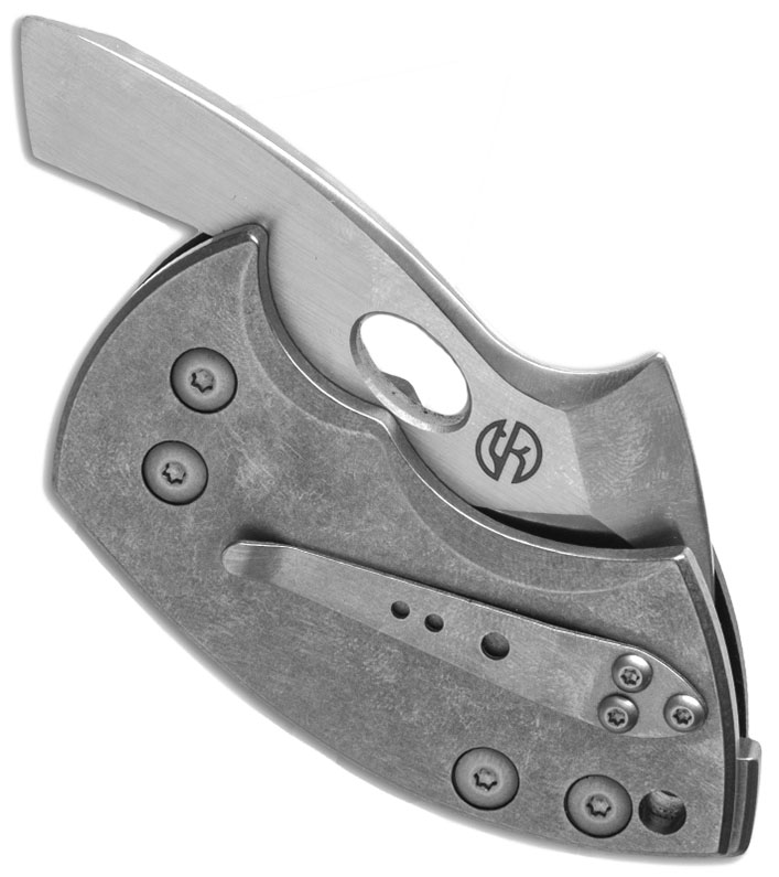 Geoff Blauvelt from TuffKnives in the U.S.A. has executed a truly unusual concept with his War Toad. As is typical for tactical friction folders, this rendition has a free floating 440C stainless steel blade with no lock. The blade tang is used to secure the blade with the clenching hand, but is also ground to a chisel shape for use as a scraper or lever. The handle consists of textured black G-10 front scale with a titanium rear scale and back spacer. The knife looks and feels rock solid. The hollow chisel grind gives the blade strength and effectiveness. The innovative pocket clip is designed for attachment to your equipment or gear. Lanyard hole. Brand new in box with pouch style sheath.