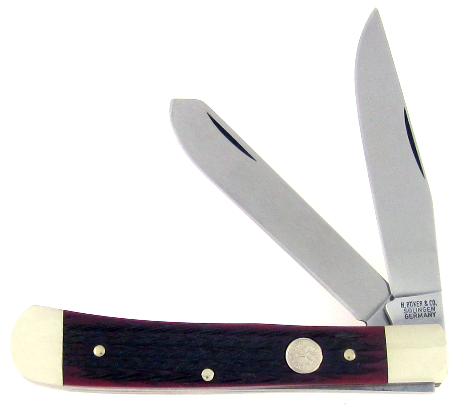 Real nice jigged red bone handle scales. Polished stainless steel clip point blade and spey blade. Both blades have good snap. Brass liners. Nickel silver bolsters, handle pins, and inlaid Solingen Tree brand circle shield. A nice looking practical pocket knife. Brand new in box.