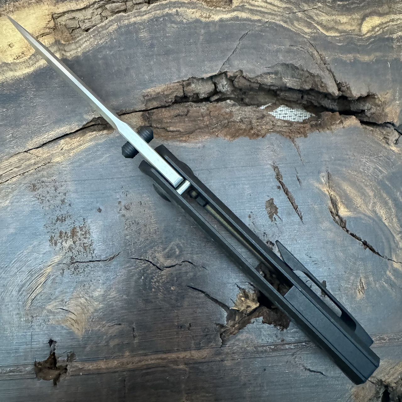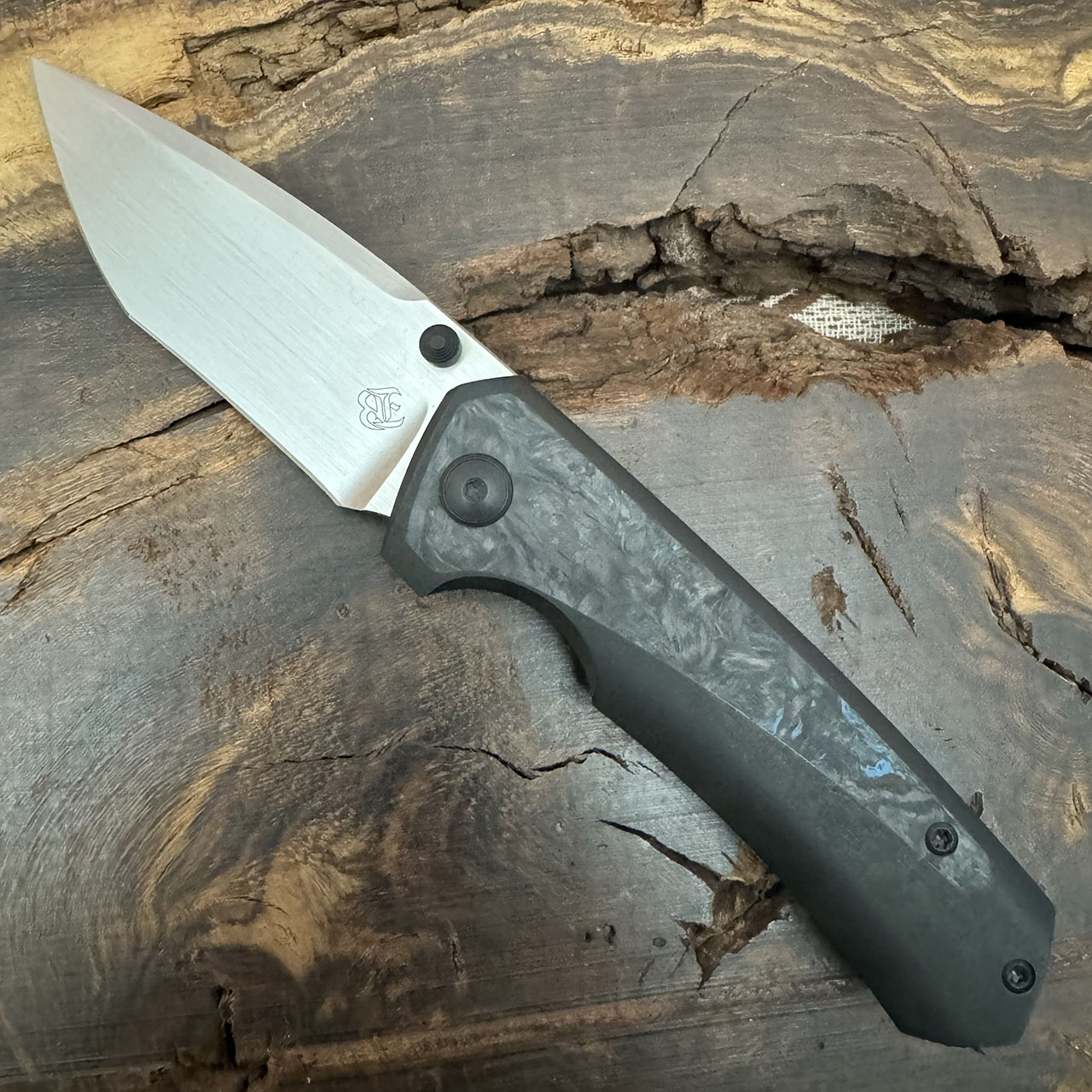 This model features black pvd titanium handles with a blue dark matter fat carbon inlay. Hand satin tanto recurve blade. Black Titanium thumbstuds, pivot collars, screws, pivot, and clip. Brand new in box.
