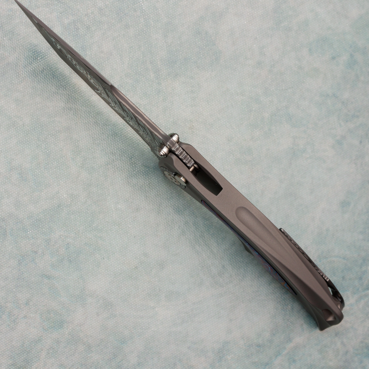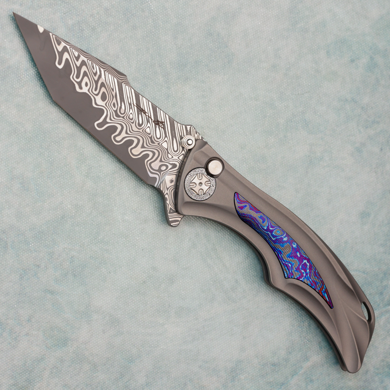 This custom model features a titanium integral handle with black timascus inlays. Damacore blade. Damasteel clip and pivot. Flipper and thumb stud deployment, with button lock. New in pouch.