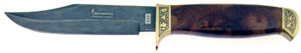 This limited edition knife features a beautiful genuine curly maple wood handle. Awesome Damascus steel clip point hunting blade etched BROWNING DAMASCUS GERMANY with Browning logo. The tang is etched with the serial number #456 of only 500 made. Fancy scroll engraved satin brass finger guard and pommel. There is not enough good things to say about this superb Browning Damascus Hunting knife. Comes mint with velvet lined walnut display box that has brass Browning Limited Edition shield on the top.