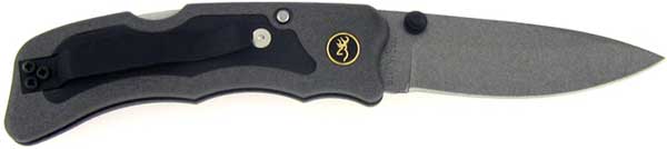 Powder coated Zytel handle scales with black kraton grip inserts on both sides. The front side says BROWNING. Silver aluminum fluorine power coated AUS-8A stainless steel drop point blade. Ambidextrous thumb studs. Browning logo inlaid shield on both sides. Black coated stainless steel pocket clip. Excellent lock back pocket companion. Brand new in box.