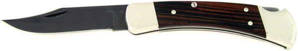 Dark hardwood handles with nickel silver handle pins. BuckCote finish stainless steel clip point hunting blade that snaps out with the push of a button. Nickel silver one piece bolsters/liners and inlaid push button. Very nicely done Buck 110 automatic lock back hunting knife. This left handed verison is extremely hard to find especially with the auto conversion and BuckCote finish. New with black Buck leather belt sheath.