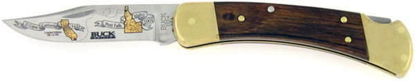 This Limited Edition Buck has real nice hardwood handle scales. Satin finished stainless steel swedged clip point hunting blade that is fancy gold etched BUCK KNIVES LIMITED EDITION 083 OF 500 EL CAJON CALIFORNIA 1947 POST FALLS IDAHO 2005 with outlines of California and Idaho. Solid one piece brass bolsters and liners. Brass and stainless steel handle pins. This knife was made to commemorate the move of Buck knives from El Cajon California to Post Falls Idaho. Another fine collectors lock back hunting knife by Buck. Comes new in zip up pouch with leather sheath.