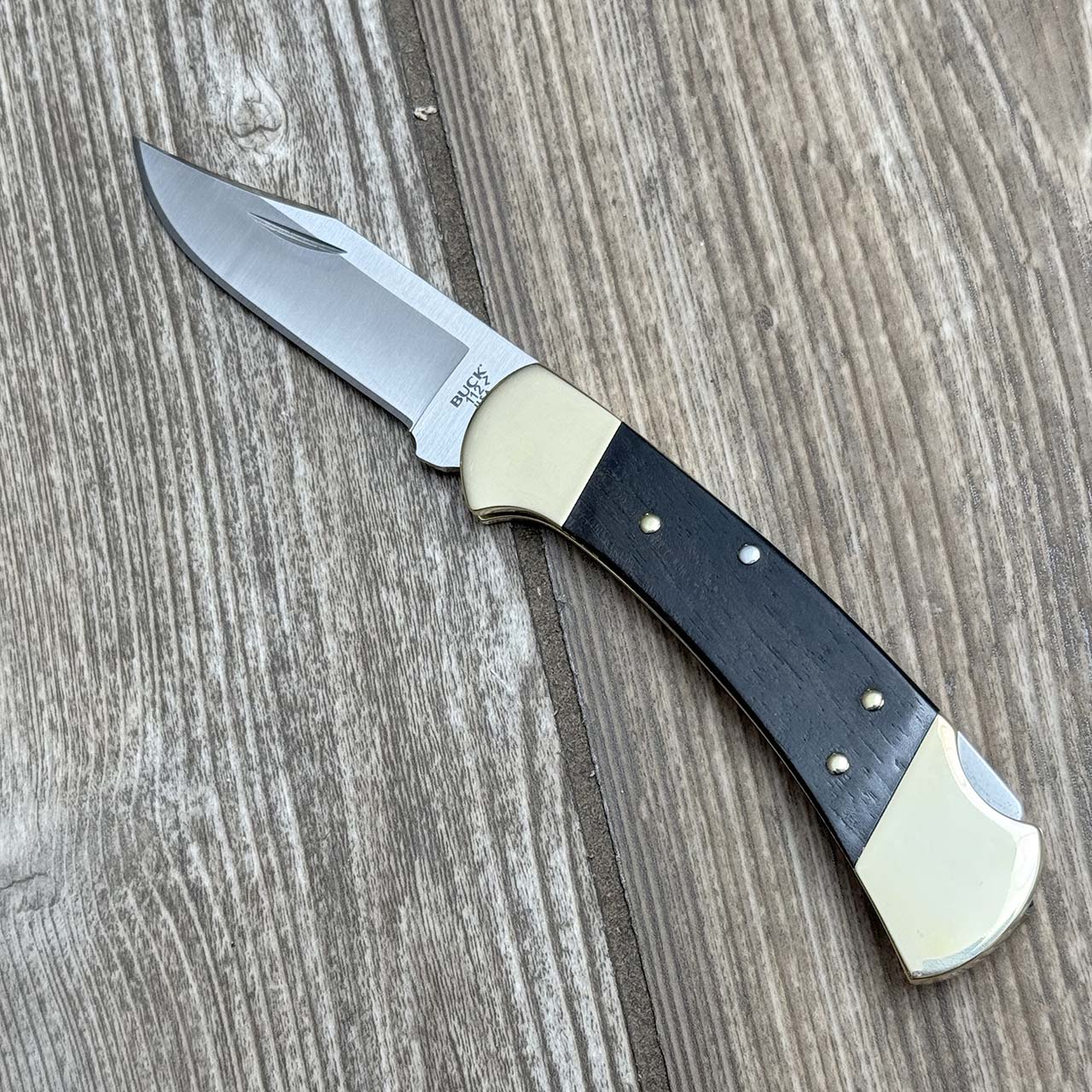 Buck 112 Slim Ranger Heritage Elite Folding Lockback Ebony Wood Handles Satin MagnaCut Blade Brass Bolsters 14260
