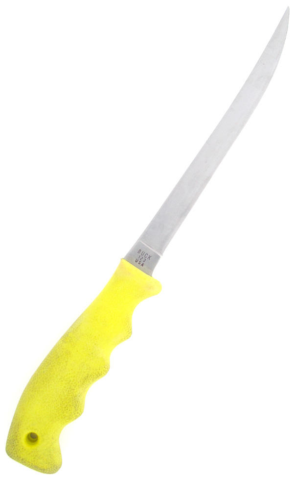 This is an old discontinued Buck knife. Textured and finger grooved yellow kraton handle. Satin finished stainless steel (440C or 425M) fillet blade. Tang stamped BUCK 123 USA. Lanyard hole. Good old Buck fillet knife with a great feel. Includes original Buck black leather sheath with insert. Excellent unused condition.