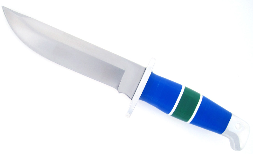 This limited edition Buck Collectors Club 25th Anniversary knife has unique blue, green and white stacked lucite handle. Big aluminum guard and pommel. Satin finished 420HC stainless steel blade. Tang stamped BUCK KNIVES BCCI USA. Made in 2013 to commemorate the 25th anniversary of the Buck Collectors Club. Hunting remains a core tradition for Buck. The Frontiersman is a classic knife that performs without complaint today. Comes brand new in limited edition two piece box with a Buck brown leather 25th anniversary BCCI belt sheath.