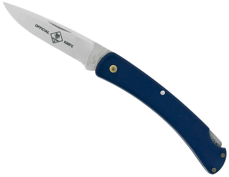 Official knife of the Boy Scouts of America. This lightweight yet durable lockback is the perfect companion on any scouting adventure. Textured blue zytel handle scales that says CUBLITE on the front. Satin finished 425M stainless steel drop point blade etched with the Official Cub Scouts logo. Stainless steel and brass handle pins. Made in the USA in the early 1980's. New condition with blue Cub Scouts sheath, no box.