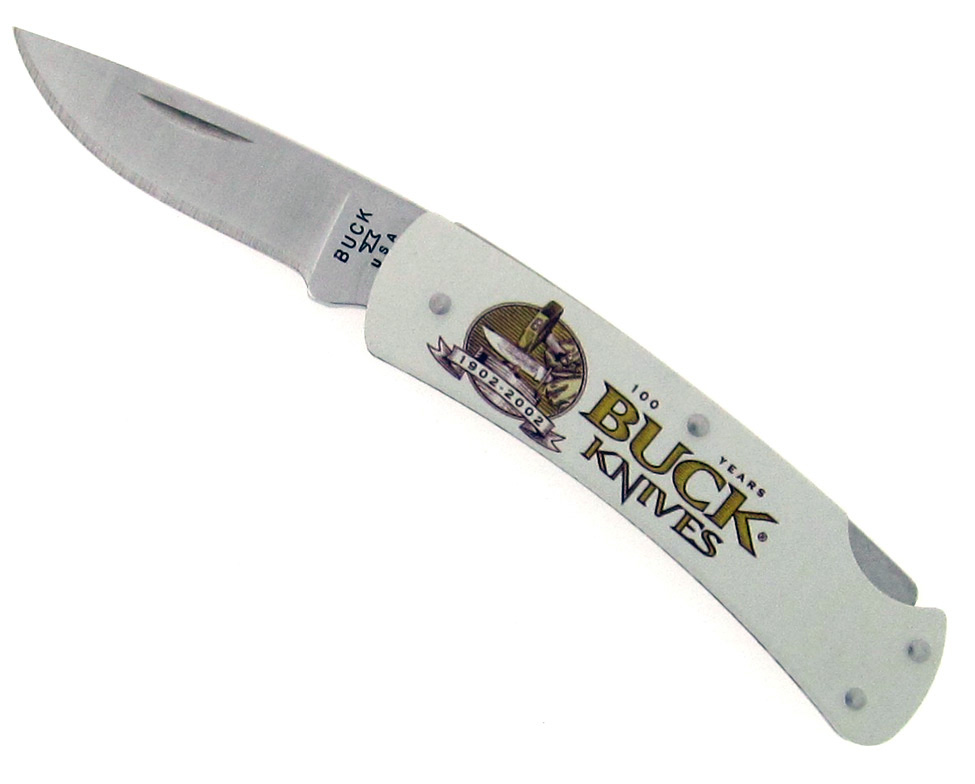 This Buck knife has satin finished aluminum handle etched with a color picture of Buck's 100 Year Centennial logo. Satin finished 420HC stainless steel drop point blade. Proudly made in the USA in 2002 to celebrate Bucks 100 year anniversary. A must have for your collection! Brand new in two piece limited edition box with paperwork.