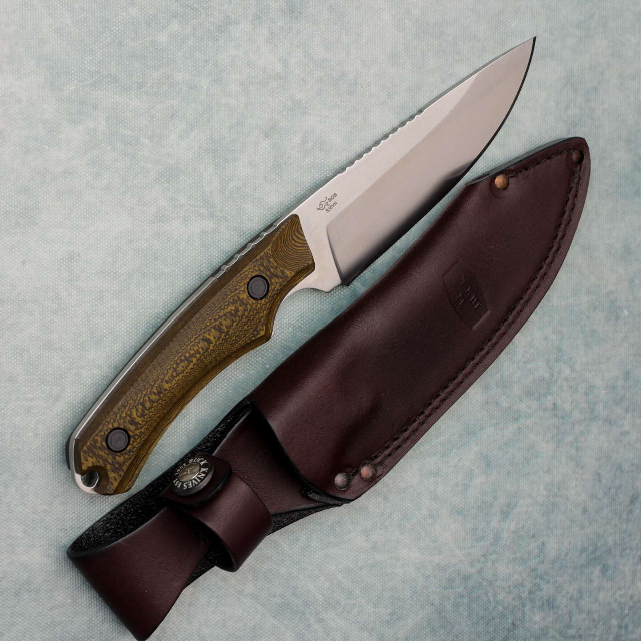 The Buck Alpha Guide is a multi purpose field knife built for hunting and rigorous outdoor use. The S35VN steel will hold an edge without needing to be sharpened often. This knife features a long blade edge with an upswept drop point blade. The high panel flat grind strengthens the blade, allowing you to cut confidently. Jimping on the top of the blade gives you the ultimate control when using different grips on the knife for detailed work. The purpose designed textured handle gives you a trusted grip, even in wet conditions. Includes a reinforced leather sheath that keeps your knife on your belt or safely in your pack. The Buck Alpha Guide is the perfect knife for the hunter and outdoorsman who demands the most of their equipment. New in Box.