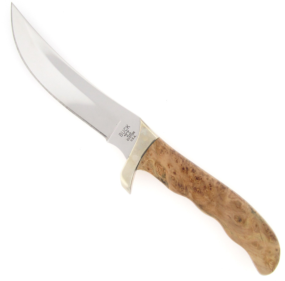 Beautiful finger grooved genuine natural Burlwood handle scales. Mirror polished 420HC stainless steel upswept blade. Full tang construction. Tang stamped with the Buck USA Custom shop logo. Nickel silver finger guard. The serial number #9 of only 100 made is etched on the back side of the blade. Includes high quality Buck brown leather sheath. New in original two piece limited edition Buck gift box.