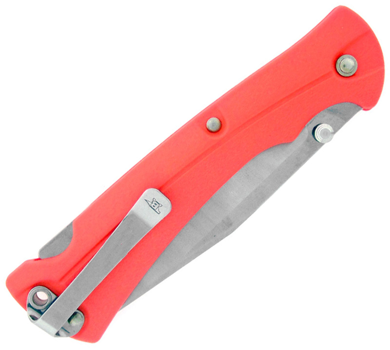 Lightly textured orange glass reinforced nylon handles. Satin finished 420HC stainless steel clip point blade etched BOONE AND CROCKETT CLUB and is stamped BUCK USA 486. Dual thumb studs for easy opening. Nickel silver handle pins. Stainless lined lanyard hole and removable pocket clip. Great value on a nice Buck folding hunter. New in box.