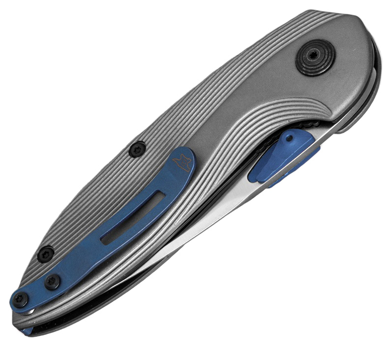Gray anodized 6061-T6 aluminum handle scales with milled step pattern for great looks and grip. Satin finished S30V stainless steel drop point blade. Blue titanium accents and tip up carry pocket clip. Black liners and hardware. Brand new in box.